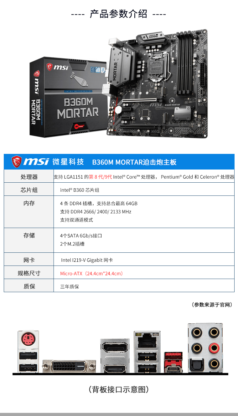 微星的B360M MORTAR迫击炮主板可谓是一款吃鸡专用主板,可以支持英特尔的众多新款处理器,比如 9100F/9400F/9500/9700F等等,7相供电,双边散热,并且给M.2 PCI-E插槽配备了钢铁装甲。