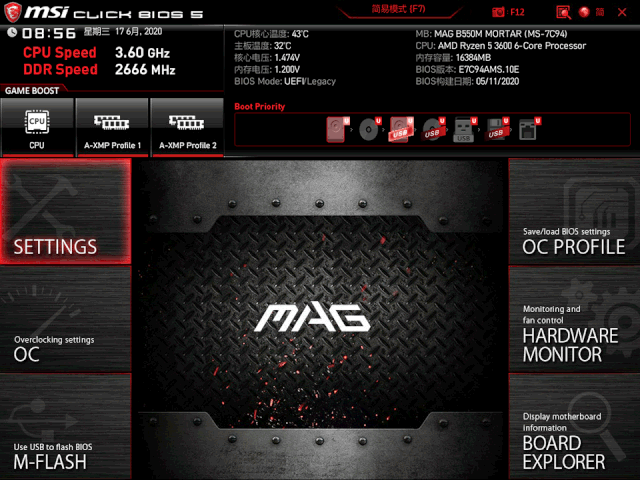 测试主板为MAG B550M MORTAR迫击炮,BIOS界面为CLICK BIOS 5,分为简易和高级两个主界面,简易界面可以快速设置声卡、硬盘、灯控。高级设置则可以设置超频等配置。