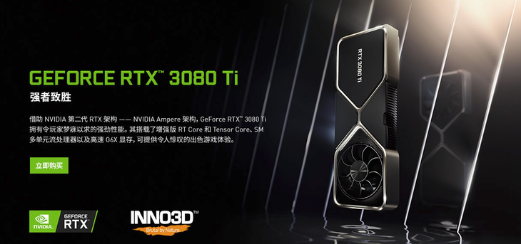 2021年6月2日,NVIDIA携手一线AIC映众(INNO3D)正式发布Ampere 架构新品GEFORCE RTX 3080 Ti。GEFORCE RTX 3080 Ti有令玩家梦寐以求的强劲性能。其搭载了增强版 RT Core 和 Tensor Core、SM 多单元流处理器以及高速 G6X 显存,可提供令人惊叹的出色游戏体验。