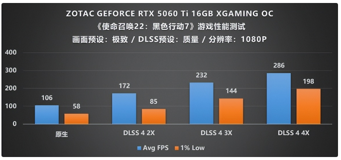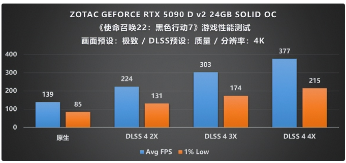 作为索泰的旗舰级显卡,如此扎实的用料配置面对最新的《使命召唤 22:黑色行动 7》自然是不在话下,我们将画面预设为极致,DLSS预设为质量模式,考虑到显卡本身的旗舰定位,分辨率自然是要上到4K,在所有设定完成后,可以在图中看到,在原生渲染的情况下,4K画质的帧率能够达到139帧,1%Low帧也接近85帧,这时候流畅游玩不成问题,不会出现卡顿的情况;紧接着我们打开DLSS 4帧生成,并调整倍率至2X,帧数竟直接跃升至224帧,帧率增幅达到了将近70%,这还没完,我们进一步又测试了3X和4X的DLSS 4帧生成倍率,帧数又实现了呈梯度式地增长,3X时从224提高到303,打开4X则又提升至最高帧377,可以说是一山更比一山高,在4K的极致画质下能实现丝滑流畅的游戏效果真是令人赞叹不已,这也许就是旗舰所赋予的意义吧。