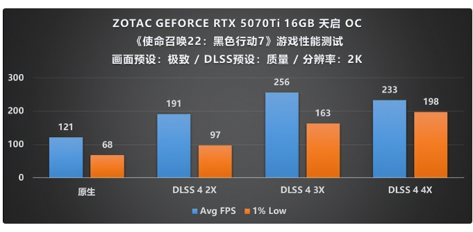 不同于RTX 5070Ti高昂的售价,RTX 5070才是常常被大众用户所考虑购入的区间,因为其相对请亲民的价格成为了市面上最主流的中端显卡,它的性能也是基本能满足主流用户的需求,由图可知,在最新发售的《使命召唤 22:黑色行动 7》中,RTX 5070的原生渲染帧率刚好过百,不过遗憾的是1%Low帧只有48,对于那些注重游戏流畅度的玩家来说或许有点瑕疵,不过没有关系,只需打开DLSS 4帧生成模式,当调节至2X倍率时帧率直接提升至157,1%Low也达到81帧的及格水平;当开启DLSS 4(3X)后帧率再度上涨了53帧,,直接拉满到4X倍率后,帧率持续增长,最终达到了256帧的完美效果,实现电竞级别的画质帧率体验,所以从最终游戏体验上来看RTX 5070并不逊色于RTX 5070Ti,可以说是花小钱办大事。