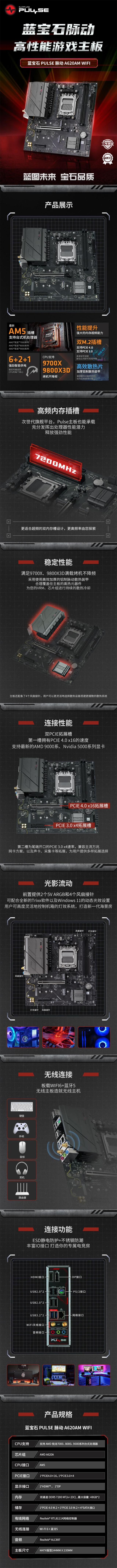 蓝宝石PULSE脉动 A620AM WIFI 主板 支持AMD 锐龙9000/8000/7000系列处理器