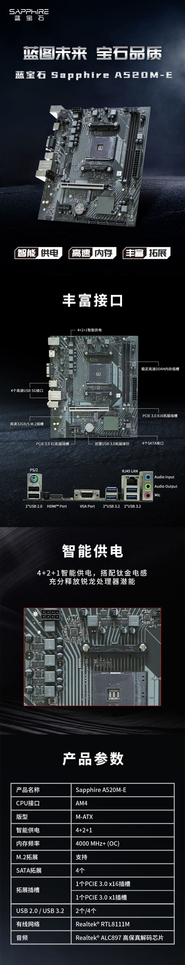 蓝宝石SAPPHIRE A520M-E主板 支持AMD 锐龙5000/4000系列处理器