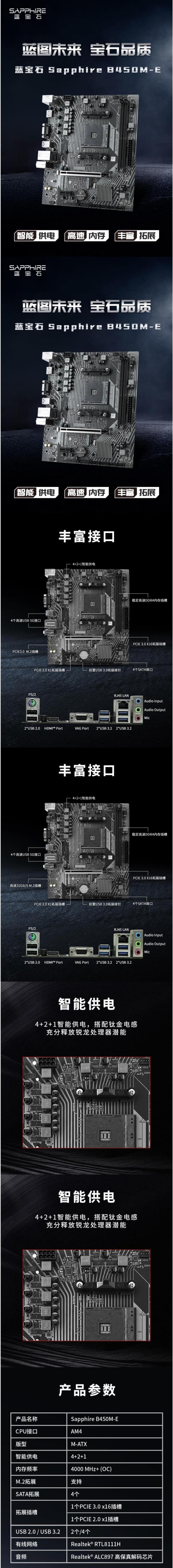 蓝宝石SAPPHIRE B450M-E主板 支持AMD 锐龙5000/4000系列处理器