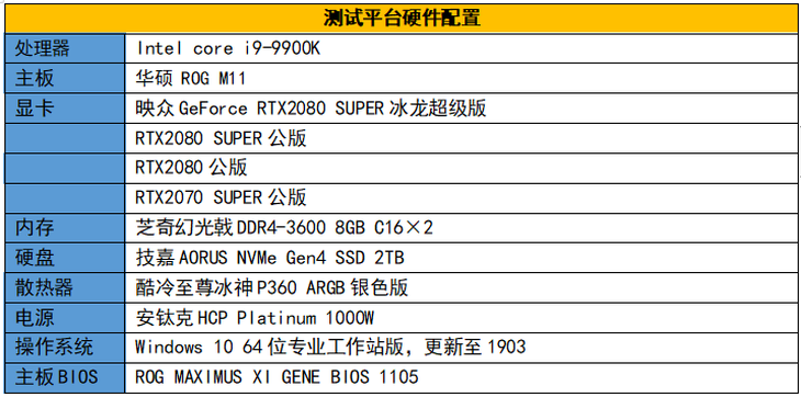 为了减少瓶颈,避免显卡测试中被其他硬件所拖累,本次测试平台全部选用高端配件。CPU方面采用Intel第九代酷睿i9-9900K、主板为华硕ROG M11G、内存为两根芝奇皇家戟DDR4 3600 C16 8GB组成双通道、硬盘为技嘉AORUS NVMe Gen4 SSD 2TB、散热器选择了酷冷冰神P360 ARGB银色版水冷、电源为安钛克HCP Platinum 1000W。