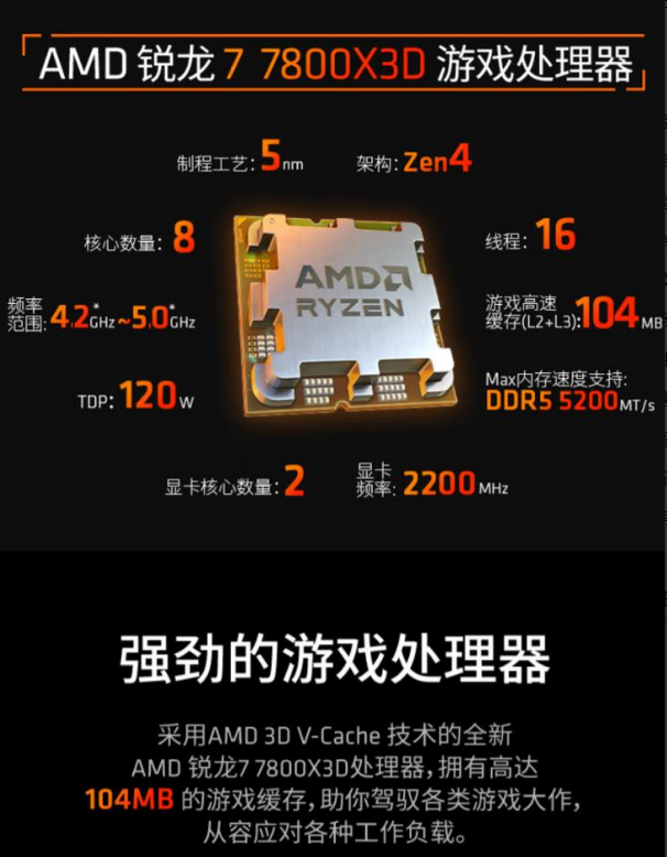 AMD 锐龙 R7 7800X3D 4.2G 8核16线程(支持集显)104M/120W 1890 2350
