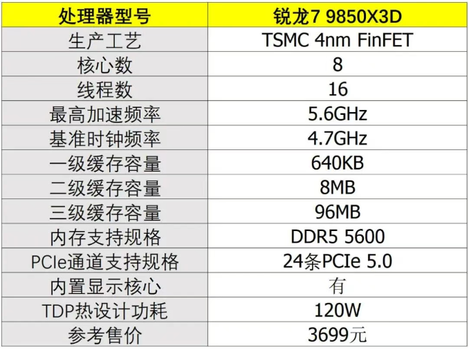 对于追求极致游戏性能的玩家而言,锐龙7 9850X3D是目前非常值得考虑的选择。这款产品采用AMD Zen 5处理器架构、TSMC 4nm工艺,以及第二代3D堆叠缓存技术。与锐龙7 9800X3D相比,它虽然仍采用8核心、16线程设计,但最高加速频率高了400MHz。与兼顾处理器内容创作性能的锐龙9 9950X3D、锐龙9 9900X3D这些全能型产品相比,锐龙7 9850X3D的核心数量没有它们多,但锐龙7 9850X3D与锐龙7 9800X3D一样,主要是为游戏而生,所以它的售价要比锐龙9 9950X3D、锐龙9 9900X3D低不少,更适合游戏玩家选择。因此单纯从游戏性能竞争力来看,锐龙7 9850X3D要强得多——它不仅有仅次于锐龙9 9950X3D的工作频率,而且作为新品,它的售价也并不高。其售价在3699元左右,比酷睿Ultra9 285K这类24核心旗舰级处理器便宜近1500元,但游戏性能却比后者强得多。