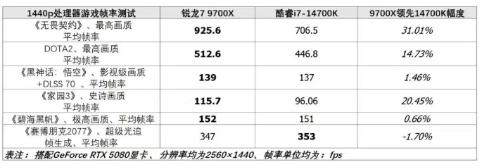 在搭配GeForce RTX 5080显卡、2560×1440分辨率下,锐龙7 9700X运行《无畏契约》训练场景时的平均帧率高达925.6fps,在部分场景中的帧率甚至能达到1100fps以上。而酷睿i7-14700K的平均帧率只有706.5fps,锐龙7 9700X的平均帧率快了多达31%,领先幅度很大。在DOTA2中,锐龙7 9700X与GeForce RTX 5080组合在训练场景下的平均帧率可以突破500fps,而酷睿i7-14700K的平均帧率不到450fps,前者也有14.7%的领先幅度。