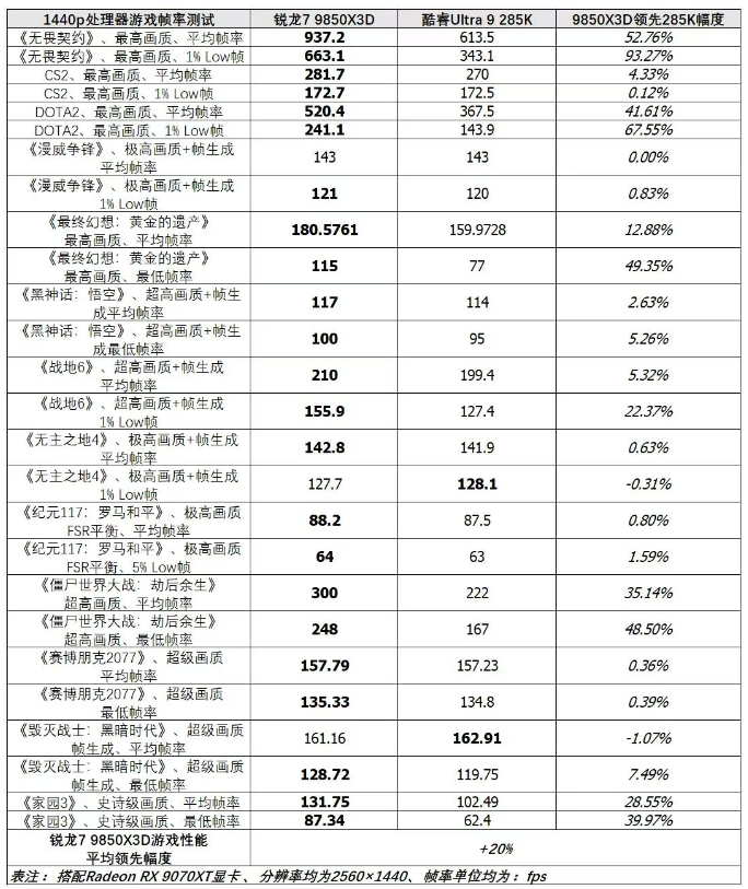 在搭配Radeon RX 9070XT显卡、2560×1440分辨率下,锐龙7 9850X3D处理器在绝大部分游戏测试中都处于领先。首先在《无畏契约》中,锐龙7 9850X3D的平均帧率可以突破935fps,其1% Low帧更领先酷睿Ultra 9 285K高达93.27%。同时在部分3A游戏中,锐龙7 9850X3D也运行得更流畅。比如《黑神话:悟空》、2560×1440分辨率下,它的最低帧率比酷睿Ultra 9 285K快了5.32%。值得一提的是在《战地6》这款游戏中,酷睿Ultra 9 285K也全面落败,无论是平均帧率还是1% Low帧都不敌对手。特别是在《战地6》的1% Low帧测试中,锐龙7 9850X3D领先了酷睿Ultra 9 285K多达22.37%。这显示出只有采用锐龙7 9850X3D才能在高分辨率、高画质设置运行《战地6》时,获得更好的流畅度。