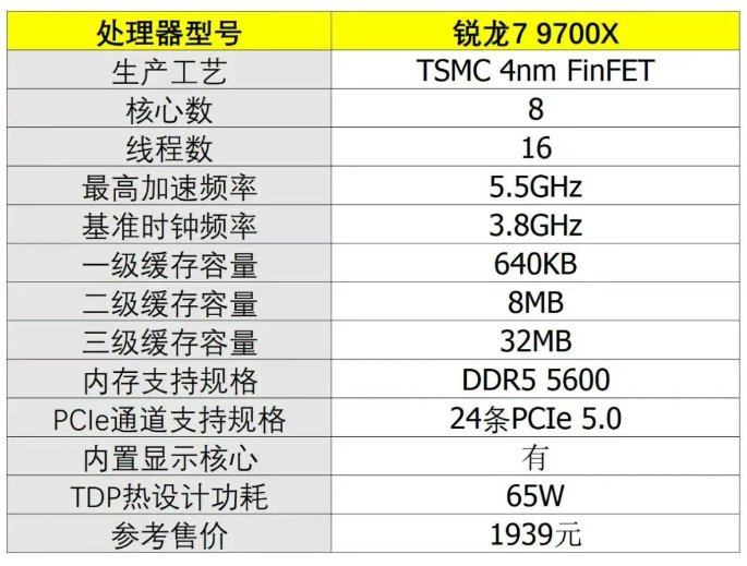 ▲锐龙7 9700X采用8核心、16线程配置,最高加速频率达到5.5GHz,但借助先进生产工艺,TDP只有65W。