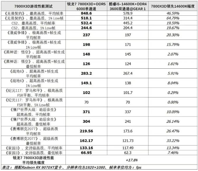 3A游戏大作中,即便在《黑神话:悟空》《战地6》这两款对硬件要求极高的游戏中,锐龙7 7800X3D的帧率表现也有明显优势,特别是在《战地6》的1% Low帧测试中,锐龙7 7800X3D的1% Low帧比酷睿i5-14600K快了多达8.04%。同时在《赛博朋克2077》《僵尸世界大战:劫后余生》 《家园3》这些游戏中,锐龙7 7800X3D的最高领先幅度可达33.22%,最低也有7.46%的优势。由于在18个测试项目中,锐龙7 7800X3D领先17个,仅1个打平,其中一些项目的领先幅度特别大,最终锐龙7 7800X3D在1920×1080分辨率下的游戏性能平均领先酷睿Ultra 7 265K高达17.8%。
