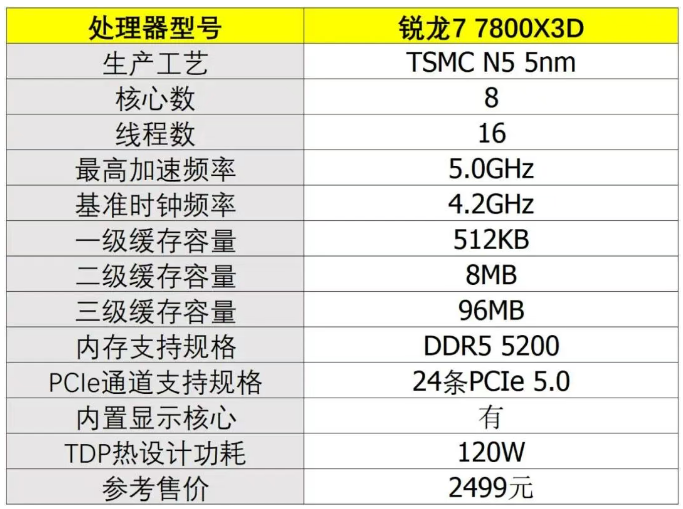 如果用户预算稍有不足,但又期望获得游戏性能强劲的AMD X3D处理器,那么锐龙7 7800X3D是不容错过的选择。它同样在32MB三级缓存的基础上,额外堆叠了64MB 3D缓存。三级缓存容量的增加可以让处理器有更大的概率在自己的缓存中找到需要处理的数据,而无须再到内存中“慢吞吞”地查找数据,也就能够大幅提高处理器的计算效率。同时,这款处理器还采用了Zen 4架构。该架构的IPC性能较Zen 3提升13%;其次它增加了用于加速机器学习和计算密集型工作负载、AI加速的AVX-512指令集,在执行部分AI运算,比如文本分类、图片超分辨率任务,以及运行PS3游戏机模拟器等支持AVX-512指令集的应用时,Zen 4处理器会有快得多的运行速度。此外,基于Zen 4架构的处理器采用TSMC N5 5nm工艺,可以有效提升能效比。技术规格方面,锐龙7 7800X3D采用8颗Zen 4大核心、16线程设计,拥有多达8MB二级缓存、96MB三级缓存。同时,锐龙7 7800X3D还拥有最高5.0GHz的加速频率,但它的功耗并不高,其TDP热设计功耗只有120W。