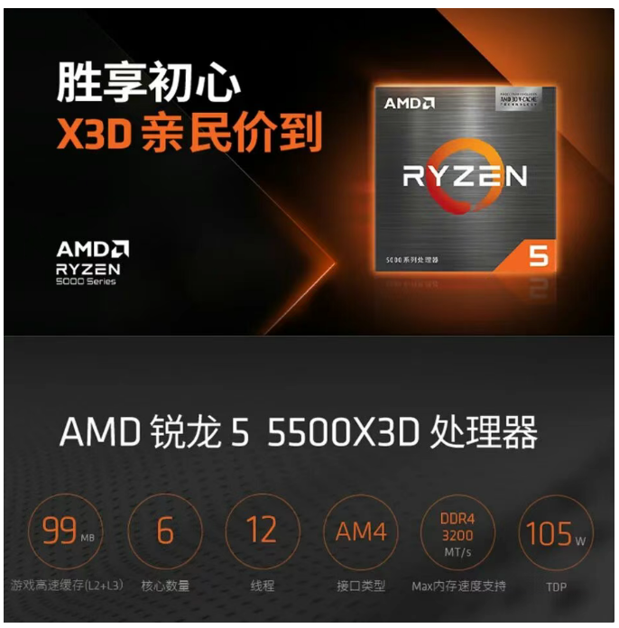 如果你正在使用DDR4内存、基于AM4接口的AMD 300系、400系或500系芯片组主板,并想进一步提升电脑的游戏性能,那么锐龙5 5500X3D处理器就是不错的选择。它是AMD为AM4老平台推出的最新产品——基于TSMC 7nm工艺、Zen 3架构,采用6核12线程设计。其基准时钟频率为3.0GHz,最大加速频率达4.0GHz,官方TDP为 105W。这款产品的核心优势在于通过堆叠64MB 3D缓存,其L3缓存总容量达到96MB,令它拥有突出的游戏性能。同时,由于它采用Zen 3架构,因此这款处理器只能使用DDR4内存,用户为它搭配价格低廉的DDR4 3200内存即可,使用成本比以上处理器都低。