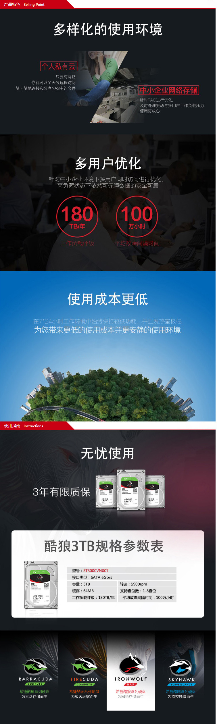 商品名称:希捷(SEAGATE)酷狼系列 3TB 5900转64M SATA3 网络存储(NAS)硬盘(ST3000VN007)