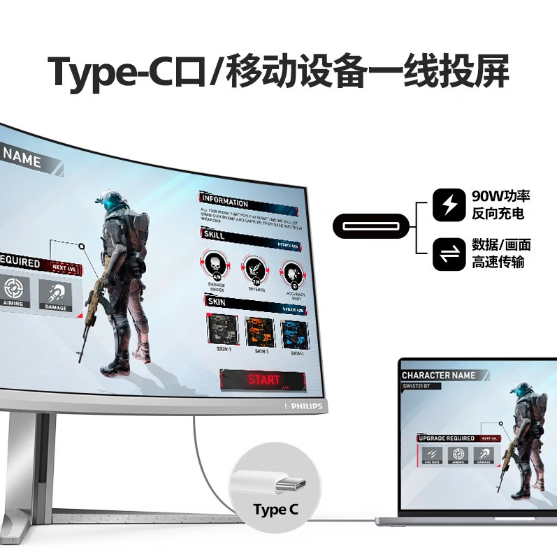 飞利浦34M2C7600MV 34英寸 Mini-LED曲面带鱼屏 WQHD HDR1400 165Hz DTS音箱 电竞显示器