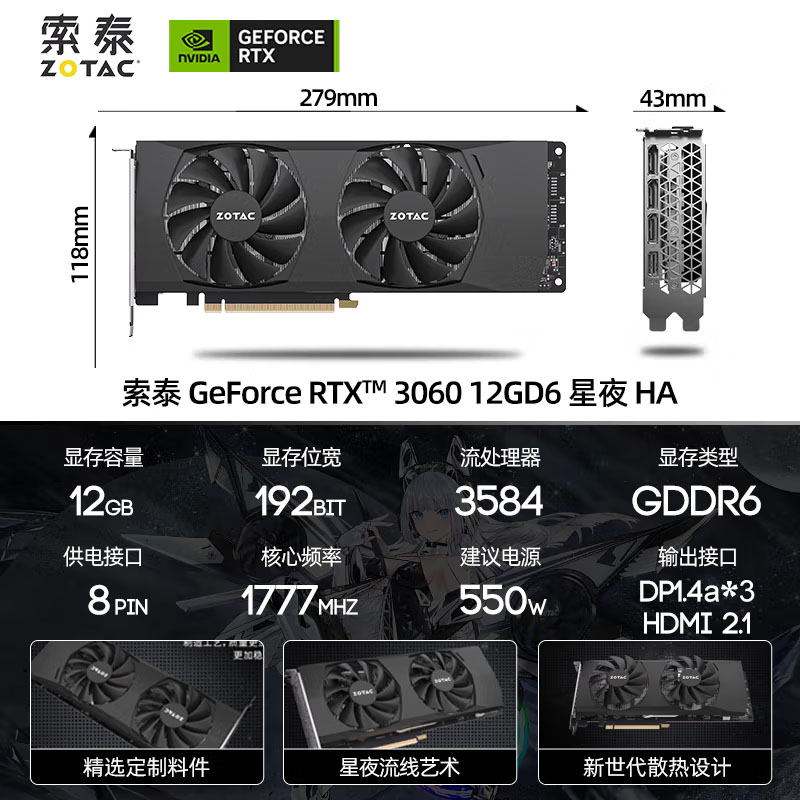 索泰(ZOTAC)RTX 3060 12GD6 星夜 HB 独立显卡 电竞游戏台式机图形 黑神话悟空高性能必备卡