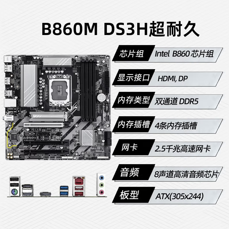 技嘉超耐久B860M DS3H DDR5主板 支持CPU Ultra U7-265K U5-245K LGA 1851